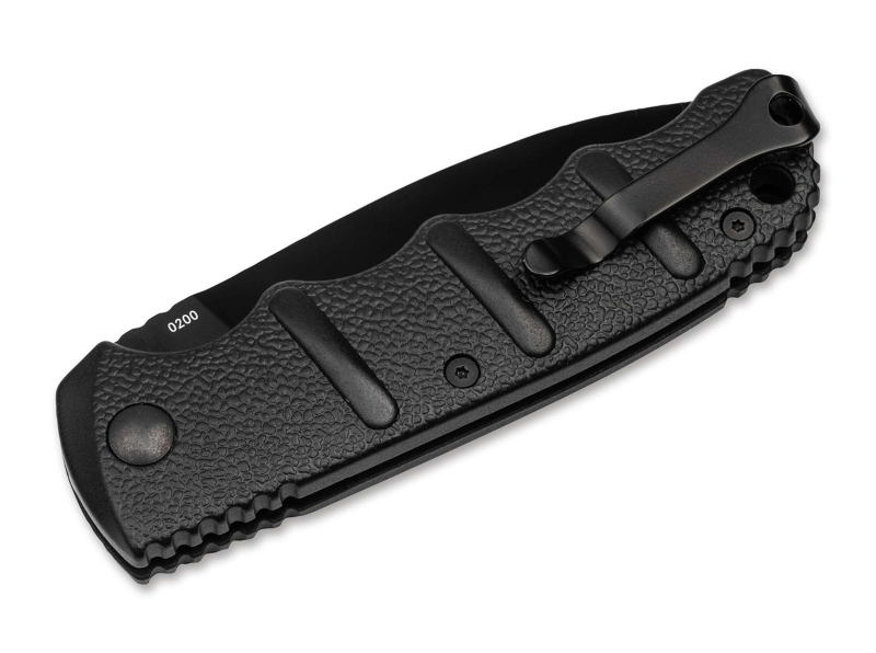 Geöffnet wird das Messer über einen Druckknopf, verriegelt jedoch nicht. Der schwarze Aluminiumgriff mit griffigen Strukturbahnen liegt auch bei sämtlichen Outdoor-Anwendungen sicher in der Hand und bietet auch bei Nässe einen sicheren Griff.