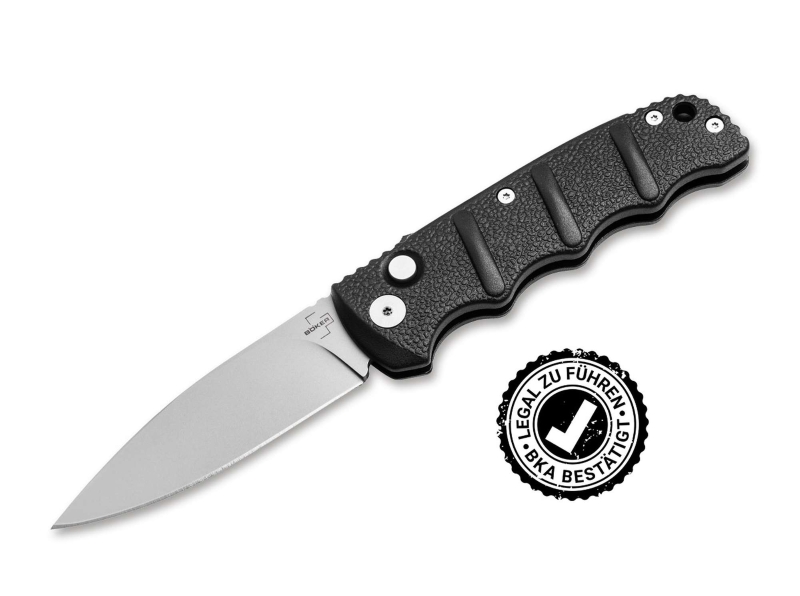 Die D2 Droppoint-Klinge bietet eine ausgezeichnete Schnitthaltigkeit sowie hohe Widerstandsfähigkeit. Geöffnet wird das Messer über einen Druckknopf, verriegelt jedoch nicht. In Kombination mit dem Slipjoint-Mechanismus ermöglicht dies eine sichere und kontrollierte Zweihand-Bedienung. Der schwarze Aluminiumgriff mit griffigen Strukturbahnen liegt auch bei Nässe oder schweißnassen Händen sicher in der Hand.