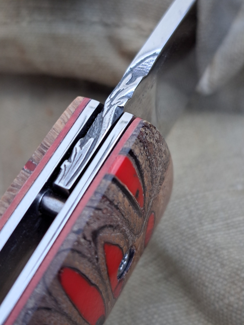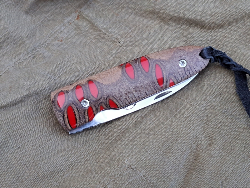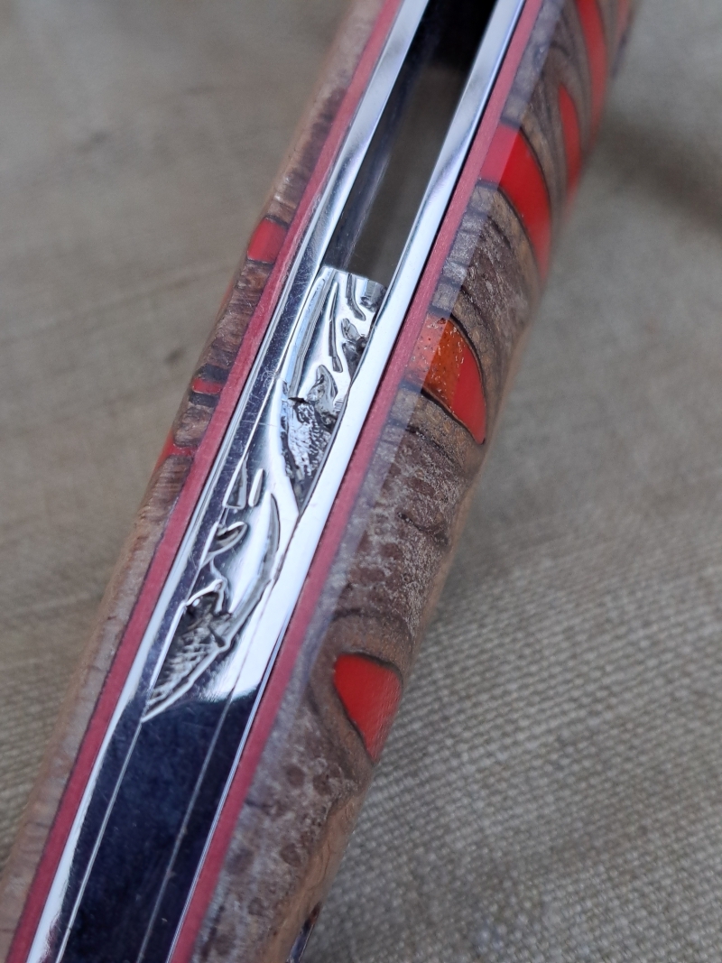 Einzigartiger Banksia-Griff: Die Griffschalen bestehen aus dem Zapfen der australischen Banksia-Pflanze. Die natürlichen Poren sind kunstvoll mit rotem Harz ausgegossen, was einen tiefen, kontrastreichen Look erzeugt.