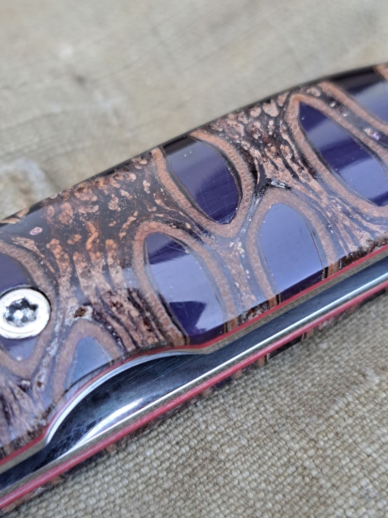 Verleihen Sie Ihrer Sammlung einen Hauch von Exzellenz. Das Citadel Saigon besticht durch seinen einzigartigen Griff aus australischem Banksia-Zapfen, dessen natürliche Hohlräume kunstvoll mit violettem Kunstharz stabilisiert wurden. Dieses Verfahren macht den Griff nicht nur robust, sondern erzeugt eine faszinierende Tiefe und Optik.