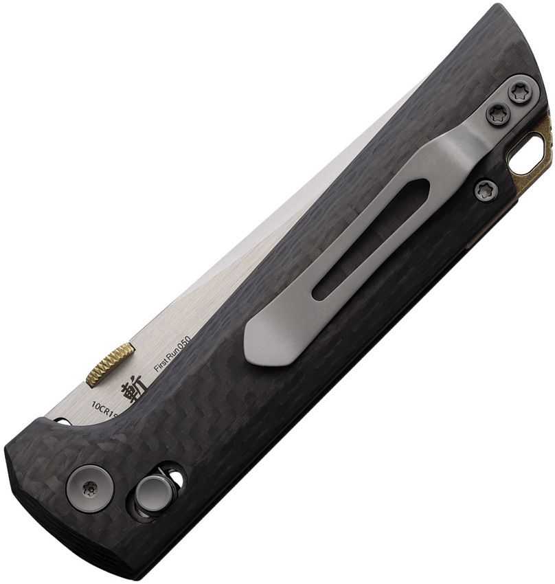 In-House forged Copper Clad Steel: Die Klinge ist ein handwerkliches Meisterstück. Der 5-lagige Stahl mit integrierter Kupferplattierung erzeugt einen atemberaubenden Kontrast zu den schwarzen Carbon-Schalen. Die rötliche Kupferlinie zieht sich wie eine Signatur über die Klinge.