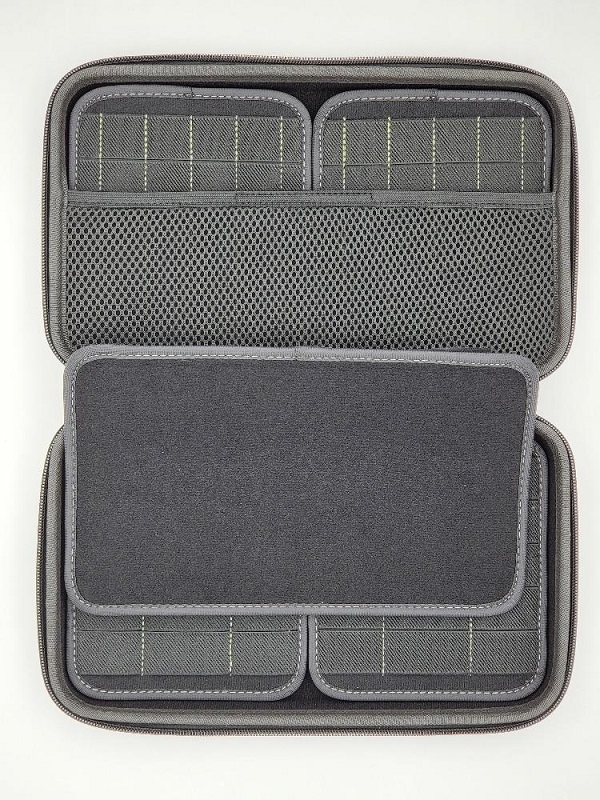 In dem 28x16,5cm Gehäuse finden Sie ein System von Klett-Flex-Panels, mit denen Sie Ihre Gegenstände sicher anverstauen können. BefestigenSie Ihre Artikel entweder in die starken elastischen Halterungen oder befestigen Sie die Clips Ihrer Messer am Gewebe selbst.