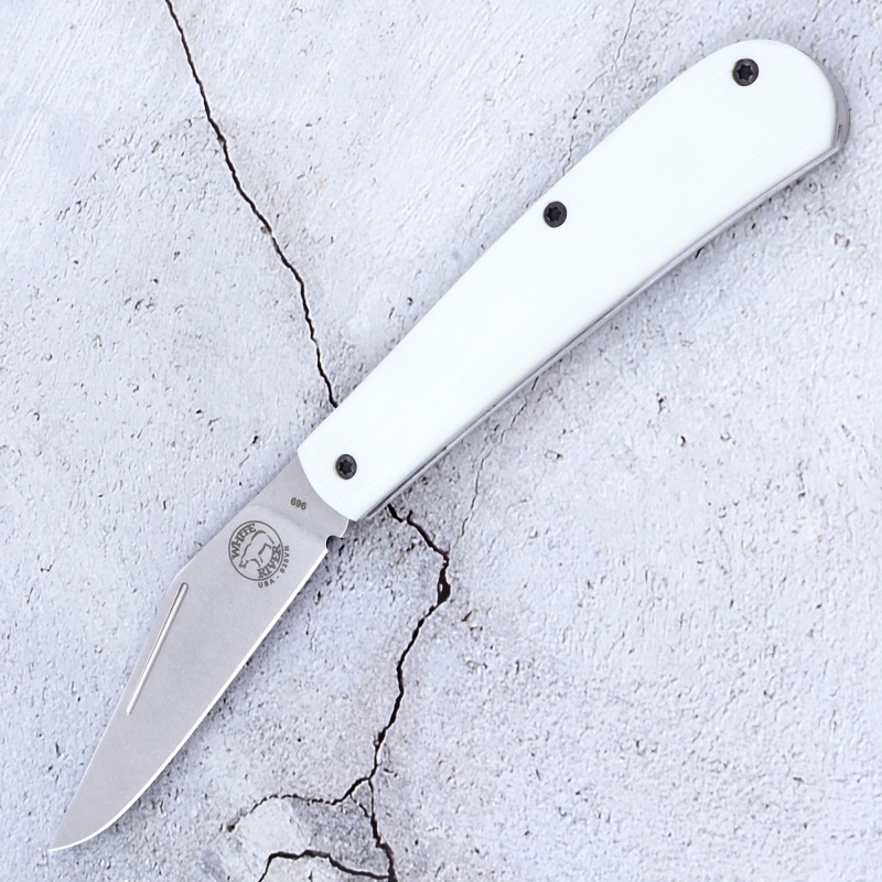 Hygienisch & Robust: Der weiße G10-Griff ist nahezu unverwüstlich, nimmt keine Feuchtigkeit auf und lässt sich nach der Arbeit (z. B. nach der Jagd) extrem leicht reinigen.