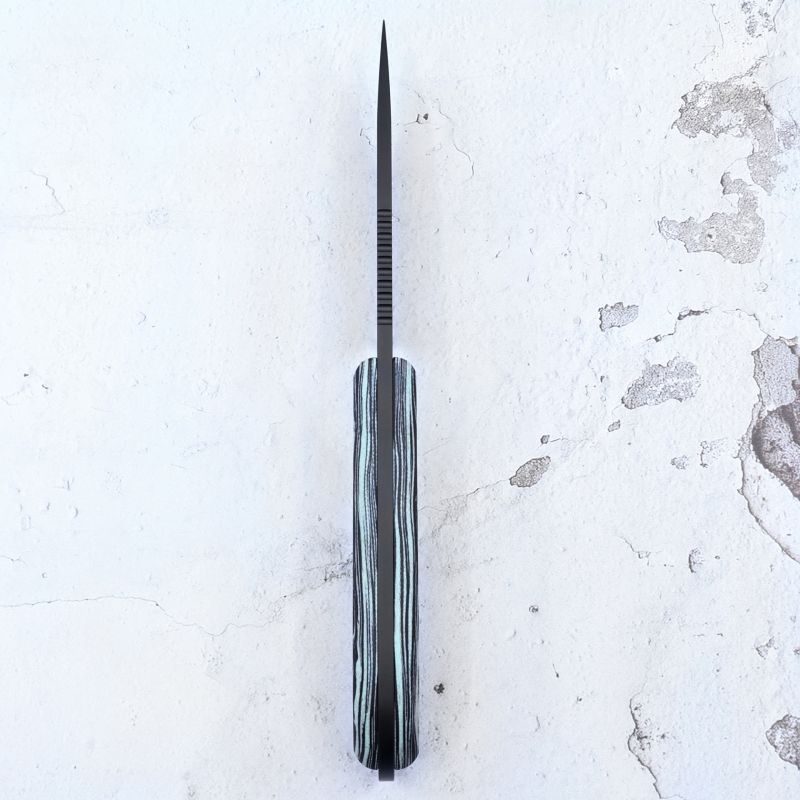 Teal G10: Die auffälligen Griffschalen aus G10 in einem tiefen Blaugrün (Teal) verleihen dem Messer einen sofortigen Wiedererkennungswert.